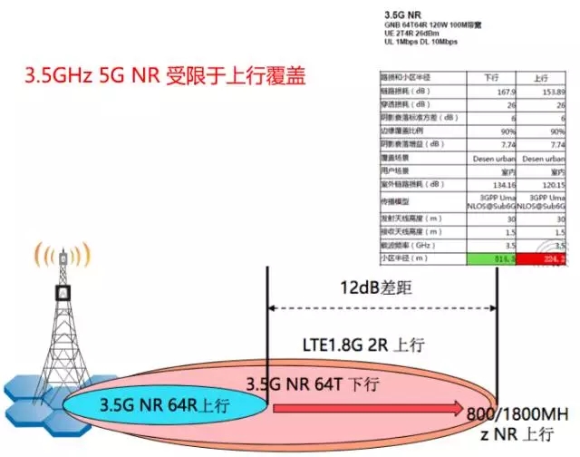 盡管如此,但由于受限于上行覆蓋,比如在上行覆蓋上,3.5G 64T64R相比LTE1.8G 2T2R仍有12dB的差距。