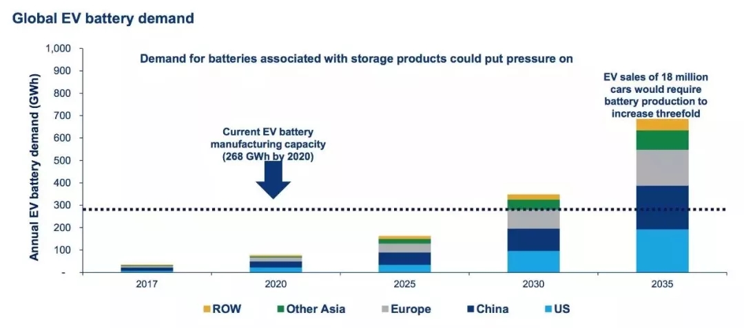 麥肯茲下面這張圖表顯示,對電池制造商來說,到2020年,用于電動汽車的電池容量規(guī)模將達到268吉瓦,這遠遠高出麥肯茲預測的2020年市場需求——100吉瓦。但在十年時間里,隨著歐美和中國市場需求的快速增長,到2028年,電池需求會反超當時的生產(chǎn)建設規(guī)模。到了2035年,電池生產(chǎn)需要增長兩倍才能滿足市場需求。