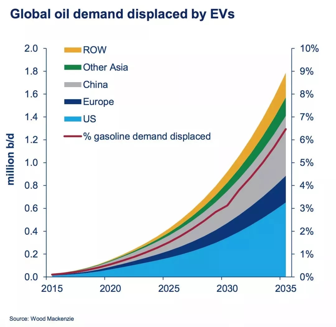 而在那些有更高減排要求的國家,比如在巴黎協(xié)議中作出了國家承諾的國家,到2035年,電動汽車有望占據(jù)整個汽車市場20%的份額。這將使汽油需求在每天下降180萬桶的基礎上,每天再額外減少500萬桶。