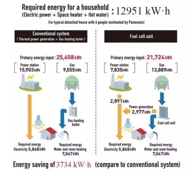 圖 1 為日本松下電器市場(chǎng)調(diào)研后得出的燃料電池直接發(fā)電與傳統(tǒng)間接發(fā)電的比較數(shù)據(jù)(4 口之家的年耗電量對(duì)比),相對(duì)于傳統(tǒng)間接發(fā)電,單個(gè)家庭通過(guò)燃料電池發(fā)電的能量消費(fèi)方式 1 年可以節(jié)約 3734 kW·h 的電量 [2]。經(jīng)過(guò)多年的發(fā)展,目前燃料電池已逐漸應(yīng)用在民用、交通、軍事等領(lǐng)域。