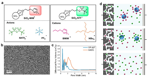 圖1.策略示意圖。a:二氧化硅接枝離子以及自由離子結(jié)構(gòu)示意圖;b:二氧化硅透射電鏡圖;c:活性炭孔徑分布圖;d:活性炭在三種不同電解液中的儲能示意圖,從上到下依次為陰離子自由、陽離子固定,陽離子自由、陰離子固定,陰陽離子均自由