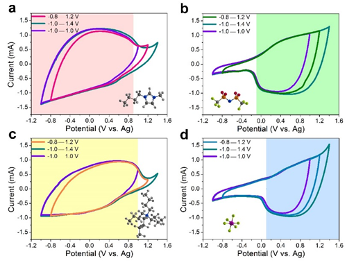 二氧化硅接枝離子液體的結(jié)構(gòu)特點(diǎn)是,一種離子(陽離子BMIM+、NBu4+或陰離子NTf2–、PF6–)是自由的;而起平衡電荷作用的帶反電荷離子:三氟甲磺酰亞胺陰離子(NTf–)和甲基咪唑陽離子(MIM+),以共價鍵的方式連接到尺寸在7nm的二氧化硅納米顆粒上。該研究所選活性炭材料絕大部分孔的孔徑小于4nm,使得連接到二氧化硅的離子被擋在活性炭孔道外面,而待測自由離子(陽離子BMIM+ 、NBu4+或陰離子NTf2–、PF6–)可通過孔道。在此基礎(chǔ)上,簡單的電化學(xué)測試即可實(shí)現(xiàn)對自由進(jìn)入孔道離子的定量分析,即利用循環(huán)伏安曲線電流的大小直接反應(yīng)離子貢獻(xiàn)的容量。