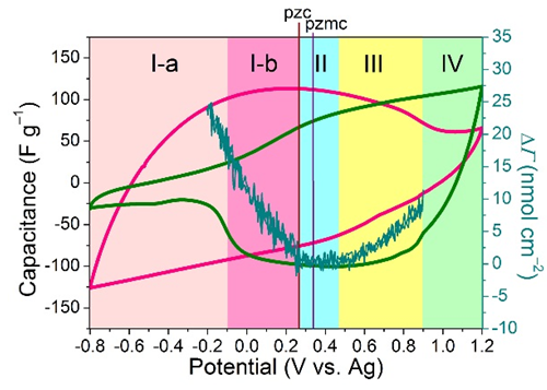基于以上方法,研究團(tuán)隊(duì)發(fā)現(xiàn),以商用活性炭YP-50F為電極,可以表征陽離子BMIM+、NBu4+和陰離子NTf2–、PF6–各自貢獻(xiàn)的容量以及每種離子貢獻(xiàn)容量的特定電壓窗口。使用石英晶體微天平(EQCM),研究人員進(jìn)一步表征了活性炭YP-50F在離子液體(BMIM-NTf2)的儲能機(jī)理,并結(jié)合BMIM+和NTf2–各自的電化學(xué)性質(zhì),對儲能機(jī)理進(jìn)行了更深層次的解釋。