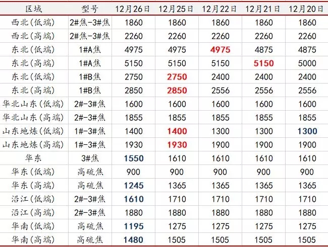 周二(12月26日)市場區(qū)域焦價價差拉低 低硫煅燒焦價格繼續(xù)上揚(yáng)