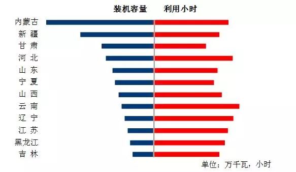 圖6 1-11月份風(fēng)電裝機(jī)較多省份風(fēng)電裝機(jī)容量和設(shè)備利用小時(shí)