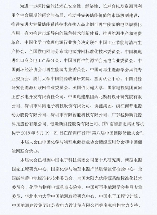 為進(jìn)一步探討儲(chǔ)能技術(shù)在安全性、經(jīng)濟(jì)性、長(zhǎng)壽命以及資源再利用全生命周期的研究與布局,推動(dòng)并完善儲(chǔ)能價(jià)值的市場(chǎng)機(jī)制建設(shè),推進(jìn)先進(jìn)大容量?jī)?chǔ)能系統(tǒng)技術(shù)在接入高比例可再生能源的電網(wǎng)規(guī)?;瘧?yīng)用,有力構(gòu)建市場(chǎng)導(dǎo)向的綠色技術(shù)創(chuàng)新體系,推進(jìn)能源生產(chǎn)和消費(fèi)革命,中國(guó)化學(xué)與物理電源行業(yè)協(xié)會(huì)決定聯(lián)合中國(guó)工業(yè)節(jié)能與清潔生產(chǎn)協(xié)會(huì)、全國(guó)微電網(wǎng)與分布式電源并網(wǎng)標(biāo)準(zhǔn)化技術(shù)委員會(huì)、中國(guó)機(jī)電進(jìn)出口商會(huì)電工產(chǎn)品分會(huì)、中國(guó)可再生能源學(xué)會(huì)光伏專業(yè)委員會(huì)、中國(guó)循環(huán)經(jīng)濟(jì)協(xié)會(huì)可再生能源專業(yè)委員會(huì)、中國(guó)可再生能源學(xué)會(huì)風(fēng)能專業(yè)委員會(huì)、廈門大學(xué)中國(guó)能源政策研究院、鑒衡認(rèn)證中心、中國(guó)能源研究會(huì)能源互聯(lián)網(wǎng)專業(yè)委員會(huì)、英國(guó)伯明翰大學(xué)、國(guó)家電投集團(tuán)黃河上游水電開發(fā)有限責(zé)任公司、中國(guó)電建集團(tuán)西北勘測(cè)設(shè)計(jì)研究院有限公司、深圳市科陸電子科技股份有限公司、協(xié)鑫集團(tuán)、浙江南都電源動(dòng)力股份有限公司、深圳市吉陽(yáng)智能科技有限公司、廣東猛獅新能源科技股份有限公司、銀隆新能源股份有限公司、TüV南德意志集團(tuán)等機(jī)構(gòu)于2018年5月19—21日在深圳市召開“第八屆中國(guó)國(guó)際儲(chǔ)能大會(huì)”。