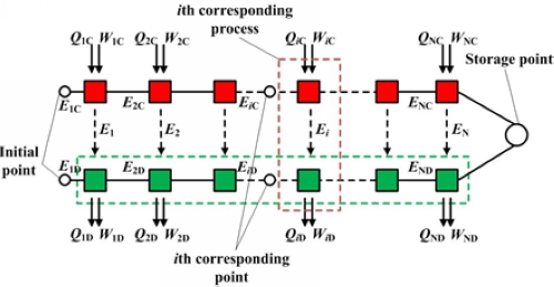 如圖1所示,壓縮空氣儲(chǔ)能系統(tǒng)流程存在對(duì)應(yīng)性,將流程對(duì)稱的過(guò)程稱為對(duì)應(yīng)過(guò)程,將流程上對(duì)稱的點(diǎn)稱為對(duì)應(yīng)點(diǎn),模型將儲(chǔ)能過(guò)程和釋能過(guò)程各分為N個(gè)過(guò)程,一一對(duì)應(yīng),從而形成N個(gè)對(duì)應(yīng)過(guò)程(如圖中虛線框所示為第i個(gè)對(duì)應(yīng)過(guò)程)和N+1個(gè)對(duì)應(yīng)點(diǎn)。為了清晰表達(dá)系統(tǒng)中?轉(zhuǎn)換和傳遞特性,提出了熱-機(jī)械?(Eth-Emech圖)圖像?方法。相對(duì)于傳統(tǒng)的優(yōu)化分析方法,對(duì)應(yīng)點(diǎn)分析優(yōu)化算法具有以下優(yōu)點(diǎn):能夠清晰揭示儲(chǔ)能和釋能過(guò)程之間的能量傳遞機(jī)理;有利于探索不同熱力過(guò)程的耦合關(guān)系;有利于獲得系統(tǒng)性能改進(jìn)和優(yōu)化的方向。