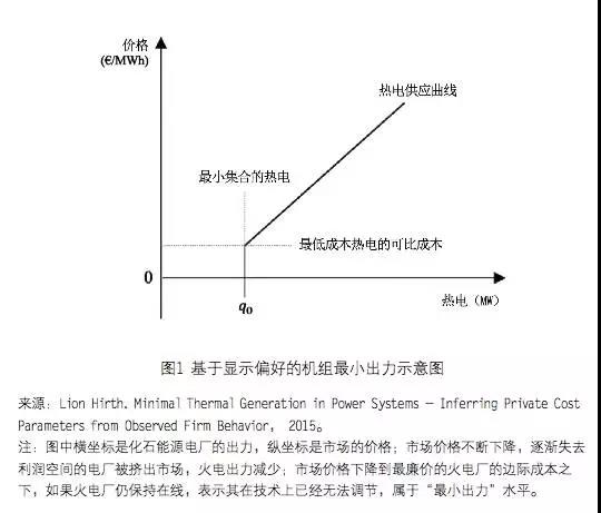 ? 向下的調(diào)峰涉及最小出力問題, 這方面的討論仍舊是非常不透明的。如果系統(tǒng)所有的機(jī)組都實(shí)現(xiàn)了最小出力,那么 證明系統(tǒng)存在嚴(yán)重的供大于求,價(jià)格需要大幅跌落,以將盡可能多的出力擠出。電 價(jià)不斷下降到低于燃料成本的程度(比如 0.1 元 / 千瓦時(shí)—0.15 元 / 千瓦時(shí)),靈活 的煤電就寧愿盡可能地停機(jī),而不愿意留在序列里承擔(dān)虧錢的損失了。那么剩下的, 就是的確“往下調(diào)不了”或者不足夠靈活參與下一階段市場的那部分。這種基于“顯 示偏好”的最小出力,往往比測算出的技術(shù)性最小出力要準(zhǔn)確得多(見圖1)。