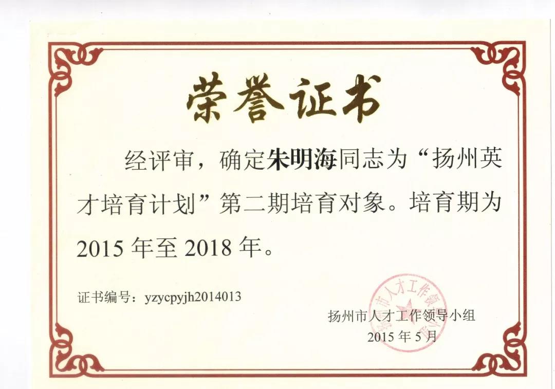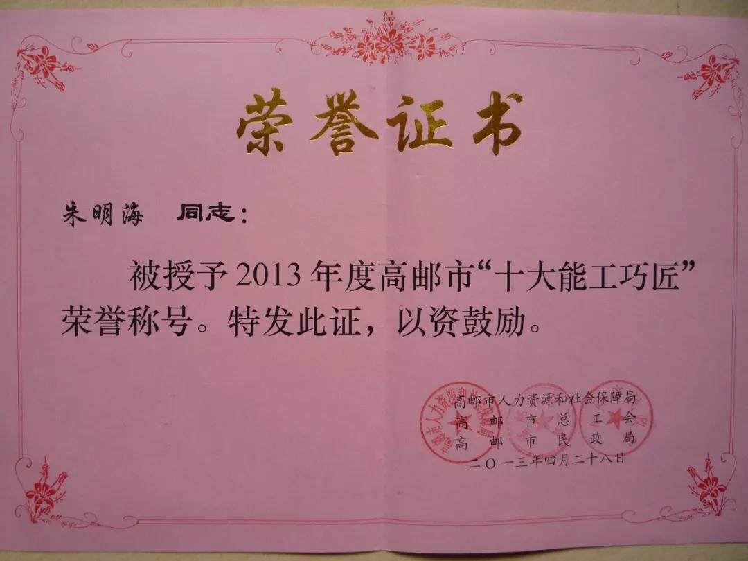 近年來(lái),朱明海先后獲得高級(jí)工程師、高級(jí)經(jīng)濟(jì)師職稱;揚(yáng)州市五一勞動(dòng)獎(jiǎng)?wù)?、揚(yáng)州英才培育對(duì)象、高郵市十大能工巧匠等榮譽(yù)稱號(hào)。