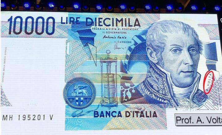 Donald Sadoway插播了一段科普小故事,最早,電池是由一位名叫Alessandro?Volta的意大利教授發(fā)明的,在意大利10000里拉的紙幣上印有他的頭像。