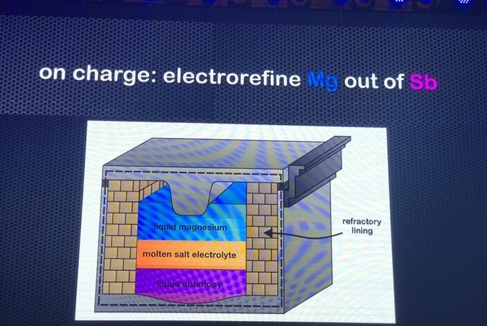 液態(tài)金屬電池結(jié)構(gòu),最底層是液態(tài)銻,中層是熔鹽電解質(zhì),上層是液態(tài)鎂,熔鹽處在兩層液態(tài)金屬的中間。