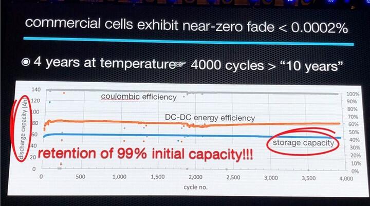 在室溫之下,液態(tài)金屬電池產(chǎn)品的壽命為4年,但它卻可以做到超過4000次的充放電——相當(dāng)于每天充放電一次可以使用10年,而且正如前面所提的,它可以在經(jīng)過4000余次的充放電后依然保有原有容量的99%。