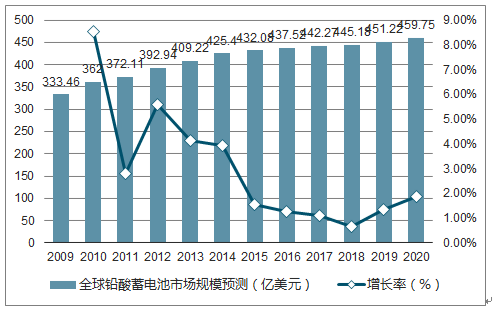 鉛酸蓄電池作為全球市場份額最大的電池類型, 全球市場規(guī)模預(yù)計仍將保持持續(xù)增長。2015 年全球鉛酸蓄電池市場規(guī)模較上年增長 1.57%,達到 432.08 億美元,預(yù)計未來 5 年將基本維持 1%-2%增長速度。