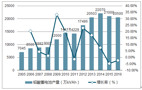 我國是全球最大的鉛酸蓄電池生產(chǎn)國、消費國和出口大國。我國鉛酸蓄電池行業(yè)主要實行以銷定產(chǎn), 鉛酸蓄電池生產(chǎn)數(shù)量減去出口的數(shù)量大致為國內(nèi)消費數(shù)量。從 2005 年至 2016 年,國內(nèi)企業(yè)鉛酸蓄電池產(chǎn)量呈波動式增長,年均復(fù)合增長率達 10.17%。