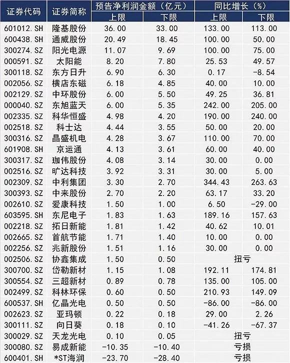 31家A股光伏企業(yè)預(yù)告凈利潤數(shù)據(jù)一覽