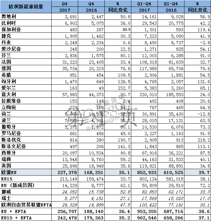中國儲(chǔ)能網(wǎng)訊:據(jù)歐洲汽車制造協(xié)會(huì)(ACEA)公布的數(shù)據(jù)顯示,2017年第四季度,歐盟地區(qū)新能源汽車的需求量繼續(xù)保持增長(zhǎng),同比增幅達(dá)到35.1%,總計(jì)售出227,378輛,在整個(gè)乘用車銷量當(dāng)中的占比達(dá)到6.7%。