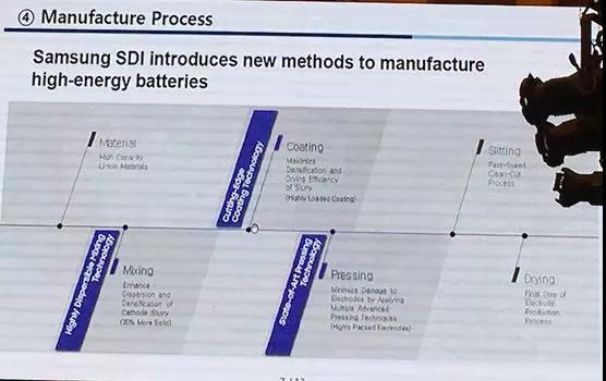 在材料工藝方面,三星采用NCA材料,因?yàn)殇囯x子在循環(huán)往復(fù)的使用過(guò)程中,容易在NCA表面形成一些殘留,會(huì)影響它的使用壽命。三星通過(guò)在NCA表面做一層金屬的涂布,減少殘留,提高它的使用壽命。