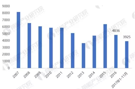 圖表1:2007-2017年全國發(fā)電新增設(shè)備容量情況(單位:萬千瓦)