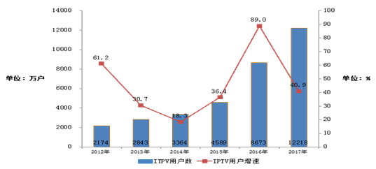 加快培育新興業(yè)務(wù),扎實(shí)提高IPTV、物聯(lián)網(wǎng)、智慧家庭等服務(wù)能力。2017年末,IPTV用戶數(shù)達(dá)到1.22億戶,全年凈增3545萬(wàn)戶,凈增用戶占光纖接入凈增用戶總數(shù)的53.5%。
