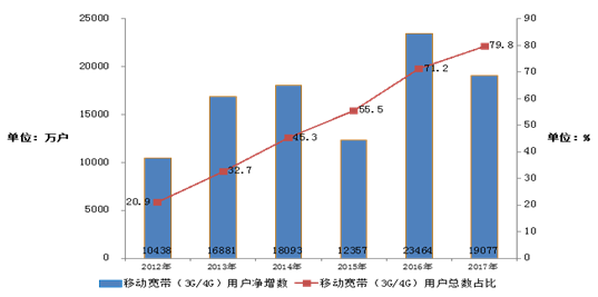 2012-2017年移動(dòng)寬帶用戶(3G/4G)發(fā)展情況