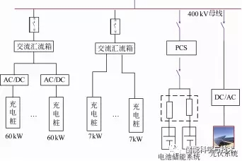 目前電動(dòng)汽車充電樁采用的恒流/恒壓充電方式調(diào)節(jié)負(fù)荷的能力有限,單獨(dú)靠電動(dòng)汽車充電進(jìn)行負(fù)荷調(diào)節(jié)效果不理想。電動(dòng)汽車充電負(fù)荷具有時(shí)空雙尺度的可調(diào)節(jié)性,利用此特性可在時(shí)間和空間上進(jìn)行雙尺度的負(fù)荷調(diào)度,使電動(dòng)汽車充電負(fù)荷對(duì)電網(wǎng)運(yùn)行產(chǎn)生積極的作用。電池儲(chǔ)能系統(tǒng)接入含分布式光伏的電動(dòng)汽車充電站的典型系統(tǒng)接線如圖10所示。
