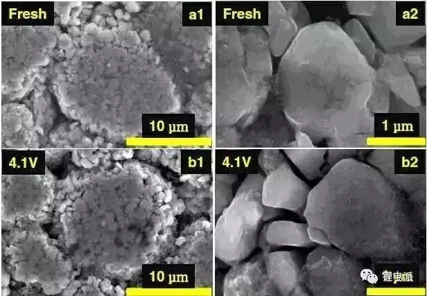 a1 a2為未經(jīng)過(guò)循環(huán)的電池SEM圖片。b~e分別為在0.5C條件下、充電截止電壓為4.1V/4.2V/4.3V/4.4V,循環(huán)200cycle后正極活物質(zhì)的SEM圖像,其中左側(cè)為低倍率下,右側(cè)為高倍率下電鏡圖片。由上圖可以看出,循環(huán)后的電池與未循環(huán)的電池在顆粒形貌、破碎程度上并沒(méi)有特別大的區(qū)別。