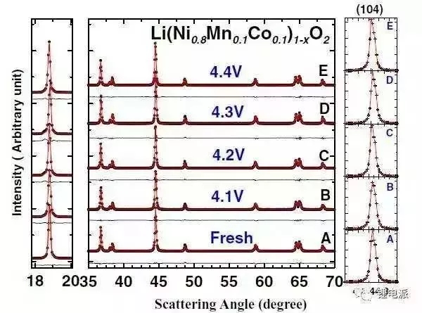 1.未循環(huán)的極片晶格常數(shù)和NCM811活物質(zhì)粉末的晶格常數(shù)是一致的。循環(huán)截止電壓是4.1V時(shí),其晶格常數(shù)也與前兩者無(wú)明顯區(qū)別,c軸有少量增加。再看循環(huán)截止電壓為4.2V、4.3V、4.4V的c軸晶格常數(shù),與4.1V的無(wú)明顯區(qū)別(差異為0.004埃),而在a軸上的數(shù)據(jù)就差異比較大了。