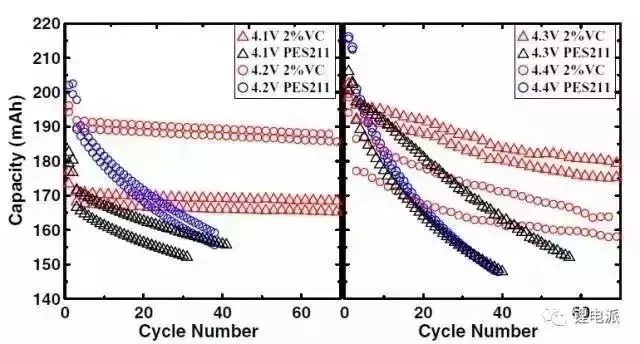 可以看出,在低截止電壓下循環(huán),電池△V較小,而電壓升高到4.3V以上時(shí),△V急劇升高,電池極化加重,這就大大影響了電池的壽命。從圖中也可以看出,VC和PES211的△V變化速率是不同的,這進(jìn)一步驗(yàn)證了電解液添加劑不同,電池極化程度、速度也是不同的。