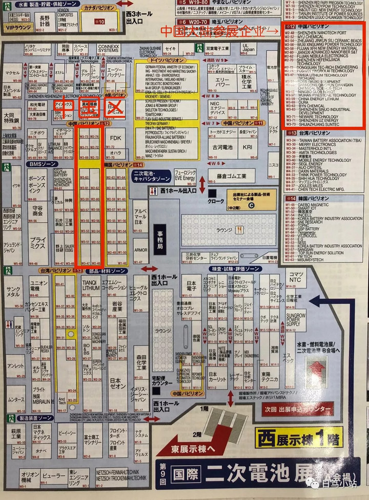 會(huì)場(chǎng)1樓主要為鋰電池展,會(huì)場(chǎng)2樓主要為燃料電池展。從展區(qū)平面圖上我們可以看出,中國(guó)企業(yè)展區(qū)占了很大一部分(這之中不計(jì)未出展中國(guó)企業(yè),但有參加展會(huì)人員)。同時(shí)也可以看出,鋰電池展會(huì)中并沒(méi)有像Panasonic,SONY,GS Yuasa等傳統(tǒng)日本電池企業(yè)的身影,他們干嘛去了?