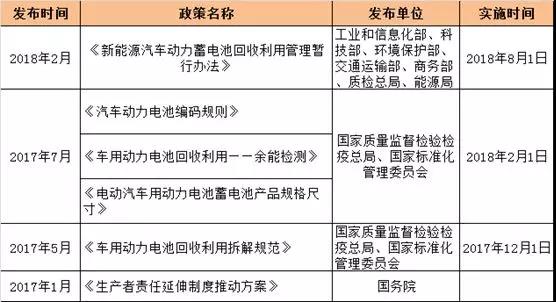 自2017年以來,隨著動力電池報廢潮小高峰日漸臨近,國家對于動力電池回收利用管理也打出了組合拳。為規(guī)范行業(yè)操作以及后續(xù)政策制定做出了一定的參考標準。