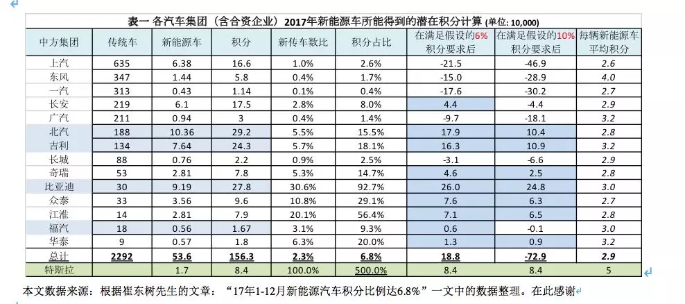 每個法人單位的數(shù)據(jù)不容易獲得,但如表一所示,假如我們設想2017年需要完成10%的積分要求的話,擁有合資企業(yè)的前五大集團公司都是缺分大戶。假如我們設想2017年需要完成6%的積分要求的話,五大集團中只有長安有多余積分,但長安和其合資企業(yè)福特需要新能源汽車的正積分來抵油耗標準的負積分。當然第一大戶上汽乘用車本身,不包括合資部分,2017年新能源車積分已達到13%;可以設想上汽的多余積分會留在集團內(nèi)。所有企業(yè)中,有最多盈余積分的是比亞迪,后面遠遠跟著的是吉利和北汽。在本土企業(yè)里,長城最低,但還是遠遠好于合資企業(yè)。表一所示,整個行業(yè)去年平均每輛新能源汽車可產(chǎn)生2.9個積分。東風集團的新能源車每輛可得4個積分。比亞迪因為有許多插電混合動力車,平均分為3。而上汽的新能源車平均每輛獲得2.6分。
