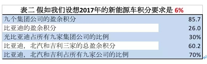 假如我們設想2017年實行6%的新能源汽車積分政策,在表一中共有9個集團公司有盈余積分。比亞迪的盈余積分占可交易的全部盈余積分的30%。比亞迪、吉利和北汽集團共占市場的70%(表二)。