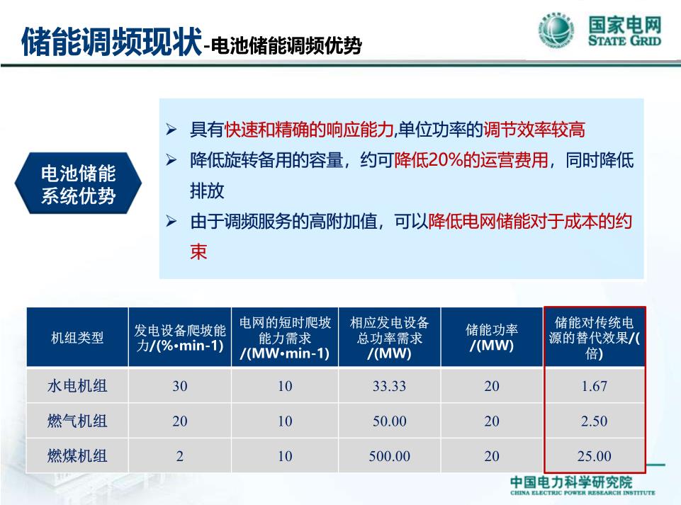 我們看一個(gè)周期之內(nèi),你跟這個(gè)指令怎么樣,這是我調(diào)頻指令下來之后,你跟不跟得上,你看這個(gè)誤差、延遲經(jīng)常有,所以,火電調(diào)頻確實(shí)實(shí)實(shí)在在地碰到了相應(yīng)的問題,急需找一種方法去提升。這個(gè)時(shí)候,儲(chǔ)能就應(yīng)運(yùn)而生。儲(chǔ)能最大的優(yōu)點(diǎn),響應(yīng)時(shí)間是百毫秒級(jí),很快。大家可以看出,這是儲(chǔ)能的指令,我跟你幾乎都能跟得上,所以儲(chǔ)能參與調(diào)頻的好處是:精度高、速度快,各方面都很強(qiáng)。有國(guó)內(nèi)的學(xué)者對(duì)儲(chǔ)能調(diào)頻能力進(jìn)行了量化,現(xiàn)在業(yè)界有這么兩種說法:一種是“儲(chǔ)能的調(diào)頻能力相當(dāng)于常規(guī)火電機(jī)組的25倍”;還有一種說法是“儲(chǔ)能的調(diào)頻能力相當(dāng)于常規(guī)火電機(jī)組的17倍”。我個(gè)人建議是中間值,25倍可能有點(diǎn)過了。從這個(gè)道理上講,就把儲(chǔ)能參與調(diào)頻的基本原理告訴給大家了,比如讓一個(gè)人從五樓直接跳到一樓肯定不行,有儲(chǔ)能在的話,搞一堆臺(tái)階,慢慢下來就沒事。所以有儲(chǔ)能在以后,可以把你的K1、K2、K3得到提升,使得綜合KP值得到提高。