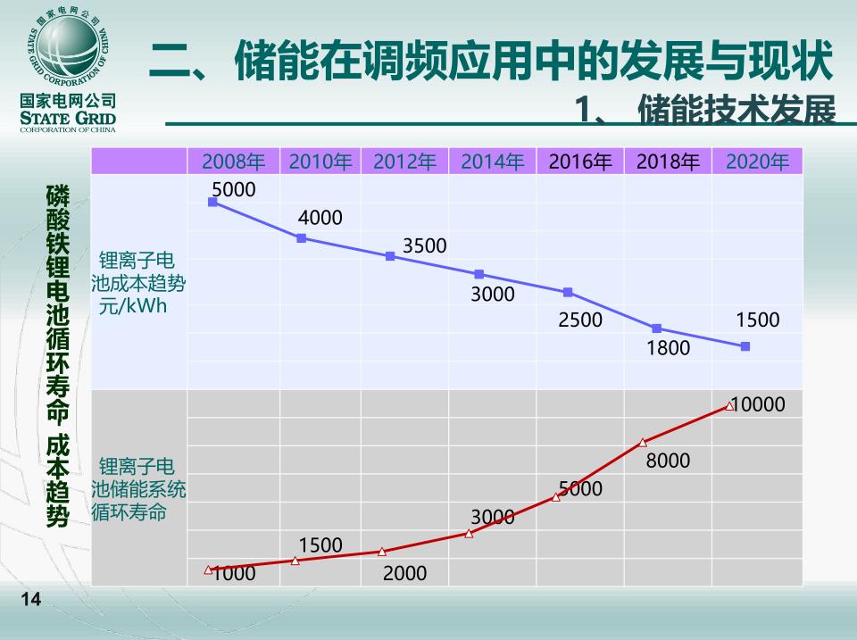 在儲能技術發(fā)展方面,大家比我掌握得數(shù)據(jù)更精確。儲能系統(tǒng)從成本在逐年下降,循環(huán)壽命在逐年上升,尤其是以鋰電池為代表,發(fā)展比較迅猛。其他的鉛炭、液流的成本也是呈下降趨勢。