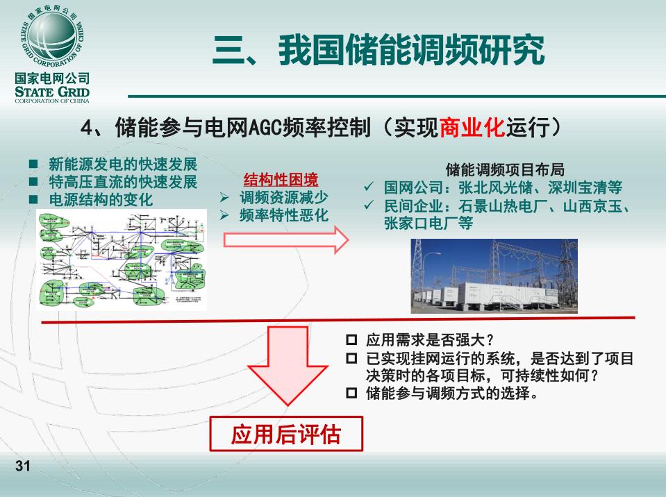 以石景山熱電廠儲能調(diào)頻項目開始,就相繼在山西、河北、浙江等省開展了此項商業(yè)運行項目,開展得如火如荼。因此,國網(wǎng)公司基于開展的這些項目,也布局了針對儲能參與電網(wǎng)調(diào)頻的應用和評估的工作。用于評估儲能調(diào)頻這個應用需求是否強大,評估已經(jīng)掛網(wǎng)運行的系統(tǒng)是否達到了項目決策時的各項目標,它的可持續(xù)性如何,對儲能參與調(diào)頻方式的選擇,最后提出建議。比如大家在儲能調(diào)頻的政策方面或者技術方面有什么想法和需求,也可以跟我們聯(lián)系,通過我們,由我們再通過我們的項目,可以向國網(wǎng)公司反映一下。