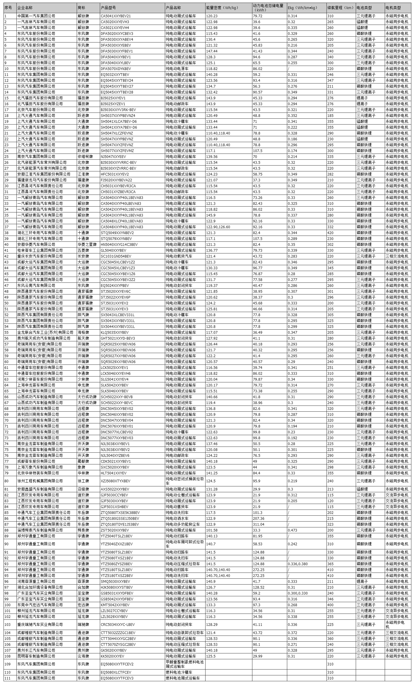 目錄中共有48家新能源專用車企業(yè)進(jìn)入推薦目錄,其中東風(fēng)汽車、東風(fēng)集團(tuán)、上汽大通、宇通重工,均有7個(gè)車型入選并列第一,吉利商用車和一汽解放青島均有6個(gè)車型入選。