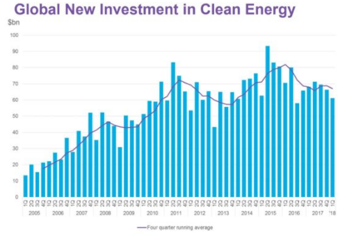 整體而言,第一季度全球清潔能源投資為611億美元,較2017年第一季度下降10%,為2016年第三季度以來(lái)的最低水平。但值得注意的是,彭博社沒(méi)有必然認(rèn)為這表明了一種趨勢(shì),并且目前并未預(yù)測(cè)年度投資數(shù)字會(huì)下降。