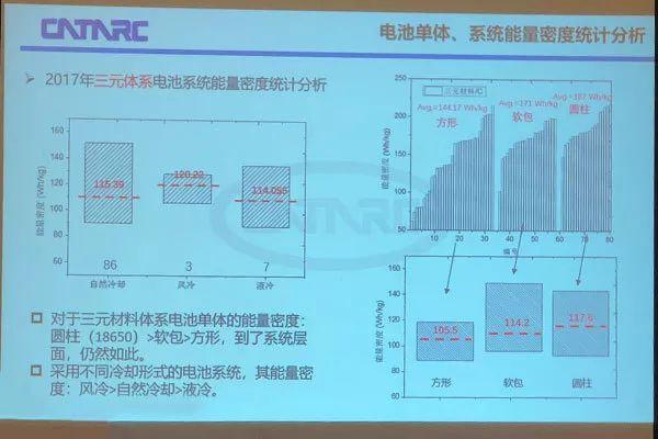 王芳提到,冷卻方式方面,中汽中心共比較了96款車(chē)型的冷卻方式,根據(jù)所對(duì)比出的數(shù)據(jù)得出的結(jié)論不是很準(zhǔn)確。因?yàn)樵谒袡z測(cè)的96款車(chē)型中只有3款使用了風(fēng)冷,7款使用了液冷。通過(guò)數(shù)據(jù)對(duì)比發(fā)現(xiàn),使用風(fēng)冷的動(dòng)力電池能量密度最高,其次是自然冷,液冷最低,她解釋道:這其實(shí)因?yàn)轱L(fēng)冷數(shù)據(jù)過(guò)少,若是相同的電池系統(tǒng),應(yīng)該是自然冷卻最高,然后是風(fēng)冷,其次是液冷,因?yàn)轱L(fēng)冷和液冷相比自然冷卻,需要的額外零部件增加了電池系統(tǒng)重量,并且在使用中需要額外消耗電力。