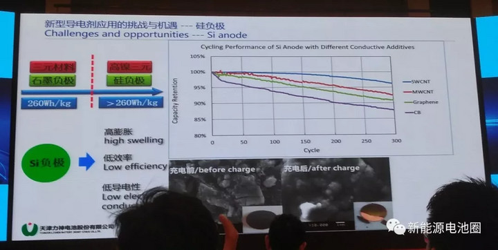 第二個報告來自天津力神王琳經(jīng)理,分享了炭黑,石墨烯,以及新型單壁碳管在硅負極的應用現(xiàn)狀和問題。