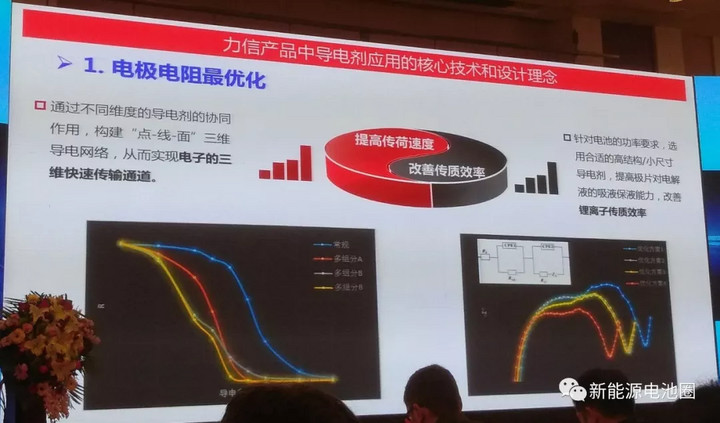 同樣的觀點是利用不同種類導電劑的協(xié)同作用,構(gòu)建點線面三維導電網(wǎng)絡,提高離子,電子傳輸速率。下圖是對比數(shù)據(jù)。