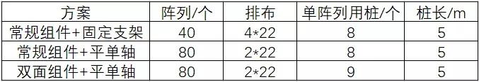 注:考慮遮擋、設(shè)備運(yùn)行等因素,雙面+平單軸方案要比常規(guī)組件方案單陣列用樁量多。