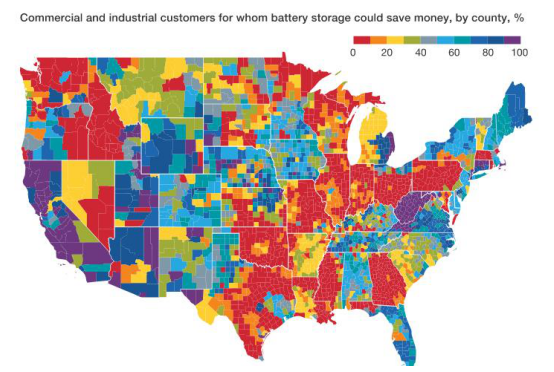 在此基礎(chǔ)上,美國分布式電池安裝市場迅速擴張,每年增長速度高達50%。迄今為止,此類安裝主要用于管理“電力需求費用”,基于電力高峰需求的月度支付。由于全年的支付與幾天內(nèi)幾小時內(nèi)最高能源消耗有關(guān),因此通過平滑電力需求以降低成本具有強烈的經(jīng)濟動機。