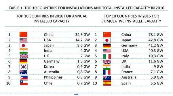 對(duì)比2016年全球新增裝機(jī)和累計(jì)裝機(jī)排名前10的國家(如下圖所示)可以看出,2017年,以中國、印度的亞洲市場(chǎng)新增裝機(jī)保持快速增長(zhǎng),并成為支撐全球光伏擴(kuò)張的重要力量,而以美國、德國為代表的歐美地區(qū)國家新增裝機(jī)則普遍出現(xiàn)增速放緩甚至負(fù)增長(zhǎng)。此外,巴西、澳大利亞等新興市場(chǎng)開始嶄露頭角,增長(zhǎng)勢(shì)頭較為明顯。