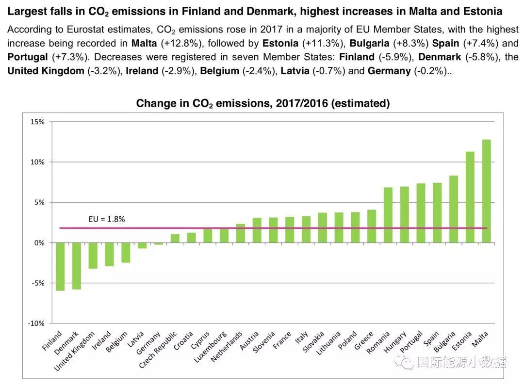 中國(guó)儲(chǔ)能網(wǎng)訊:根據(jù)Eurostat剛剛發(fā)布的數(shù)據(jù),2017年歐盟國(guó)家能源相關(guān)的碳排放比2016年增長(zhǎng)1.8%。歐盟國(guó)家中排放增長(zhǎng)幅度比較大的國(guó)家有:馬耳他(+12.8%)、愛沙尼亞(+11.3%)、保加利亞(+8.3%)、西班牙(+7.4%)、葡萄牙(+7.3%);排放減少的國(guó)家有:芬蘭(-5.9%)、丹麥(-5.8%)、英國(guó)(-3.2%)、愛爾蘭(-2.9%)、比利時(shí)(-2.4%)、拉脫維亞(-0.7%)、德國(guó)(-0.2%)。