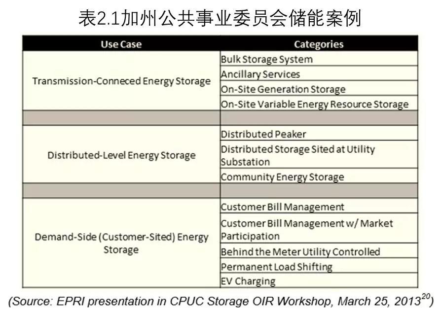 加州公共事業(yè)委員會儲能行動R1012007中,一系列儲能應(yīng)用案例得到研究。如表2中所示,加州公共事業(yè)委員會將采用三個基本例子。與輸電線相連接的儲能電站,在ISOs的監(jiān)管下可提供電網(wǎng)相關(guān)的輔助服務(wù)和電量市場競價(jià)。此外,儲能可作為調(diào)峰容量提供商供應(yīng)系統(tǒng)容量。與配電線相連接的儲能電站可幫助解決區(qū)域特定變電站問題(解決電壓問題、緩解設(shè)施升級等),同時(shí)為電網(wǎng)提供輔助服務(wù)。消費(fèi)側(cè)儲能電站,可削減用戶峰值負(fù)荷、節(jié)省電費(fèi)同時(shí)提高電能質(zhì)量和供電可靠性。