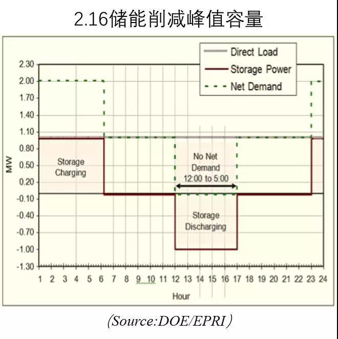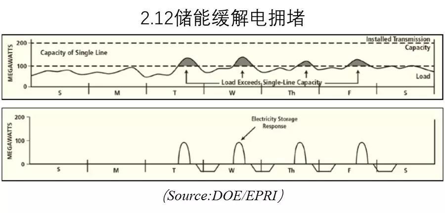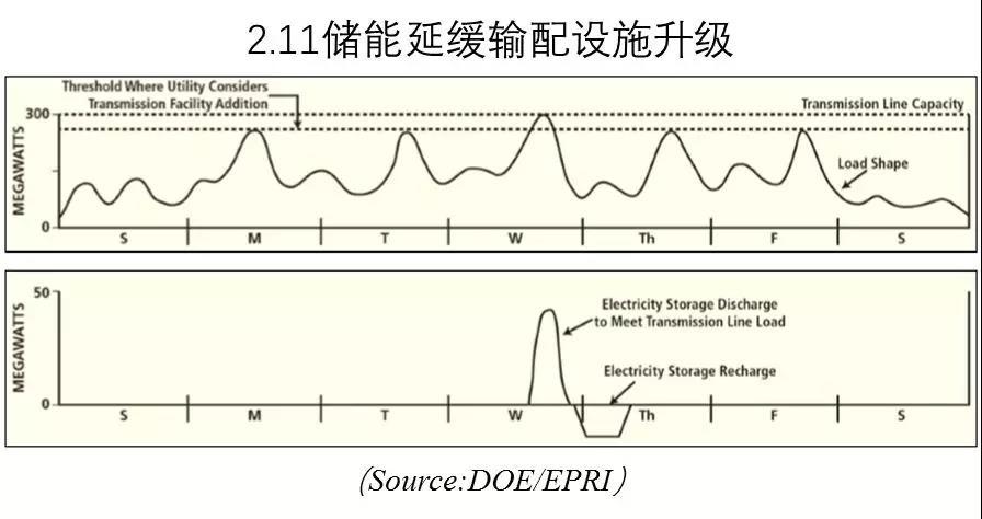 圖2.11表明儲能延緩輸電升級。儲能在輸電設(shè)施峰值負(fù)荷時(shí)放電,將輸電負(fù)荷降低。