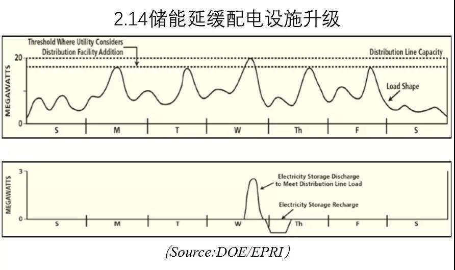 眾所周知,配電系統(tǒng)中絕大部分節(jié)點(diǎn)最大負(fù)荷,出現(xiàn)在每年的幾天的幾個小時(shí)。儲能電站可以有效削減其峰值,為電網(wǎng)帶來顯著收益。此外,儲能還可為配電線路提供電壓支撐。通常電網(wǎng)通過調(diào)節(jié)變電站的調(diào)節(jié)器和電容器實(shí)現(xiàn)穩(wěn)定電壓的目的。在徑向長線路中存在大型負(fù)荷如電弧焊或分布式光伏系統(tǒng)情況下會產(chǎn)生電壓波動,可通過儲能電站有功出力解決。圖2.14表現(xiàn)了儲能延緩輸配設(shè)施升級應(yīng)用。