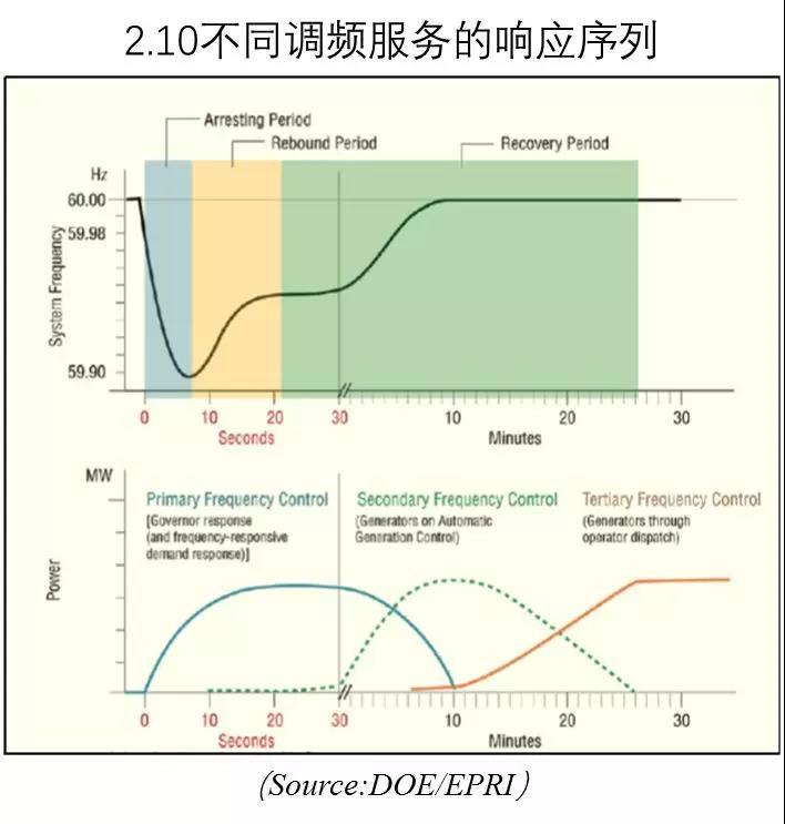 頻率響應(yīng)跟調(diào)頻服務(wù)非常類似,但是其響應(yīng)系統(tǒng)時(shí)間更短,當(dāng)電網(wǎng)發(fā)生發(fā)電廠或輸電線掉線的情況下在幾秒到一分鐘范圍實(shí)現(xiàn)響應(yīng)。如圖2.10所示,需要很多發(fā)電設(shè)施響應(yīng)以抵消電網(wǎng)中發(fā)電和負(fù)荷之間不平衡,保證系統(tǒng)頻率和電網(wǎng)穩(wěn)定性。在事故發(fā)生后幾秒內(nèi)最先響應(yīng)的是一次調(diào)頻控制,提高發(fā)電廠的功率輸出。之后半分鐘到幾分鐘時(shí)間內(nèi)二次調(diào)頻控制響應(yīng)AGC信號,其曲線為點(diǎn)狀線。在事故發(fā)生后,電網(wǎng)頻率下降速率跟發(fā)生故障的慣性量占比成正比。