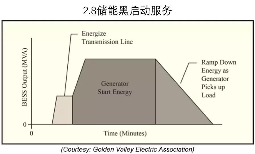 黑啟動是儲能電站在電網(wǎng)崩潰后為電網(wǎng)提供功率和能量以激活輸配電線路和為發(fā)電站啟動提供電能。金谷電力協(xié)會在費(fèi)爾班克斯使用儲能提供黑啟動服務(wù)以備跟安克雷奇的輸電線路中斷。圖2.8為儲能電站運(yùn)行情況,剛開始放電為兩條輸電線路提供所需電流,同時(shí)為兩個柴油發(fā)電機(jī)提供啟動電能,直至電網(wǎng)恢復(fù)。只要容量合適和有輸電線,儲能也可為大型電站提供啟動電能。