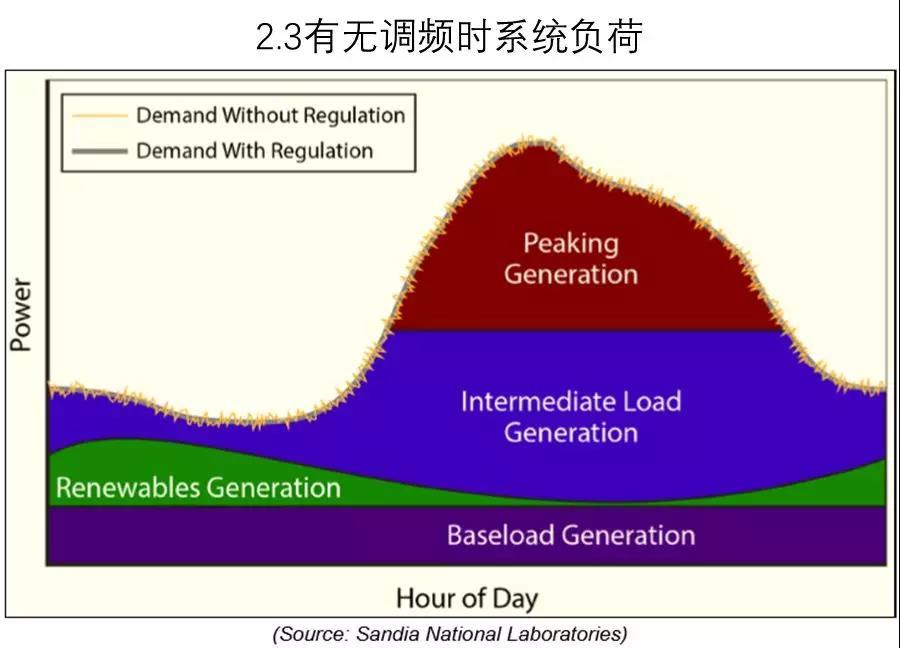 圖2.3顯示細(xì)負(fù)荷曲線為無調(diào)頻服務(wù)情況下因發(fā)電和負(fù)荷不平衡產(chǎn)生大量波動,而粗負(fù)荷曲線為調(diào)頻輔助服務(wù)抑制了波動后的平滑曲線。
